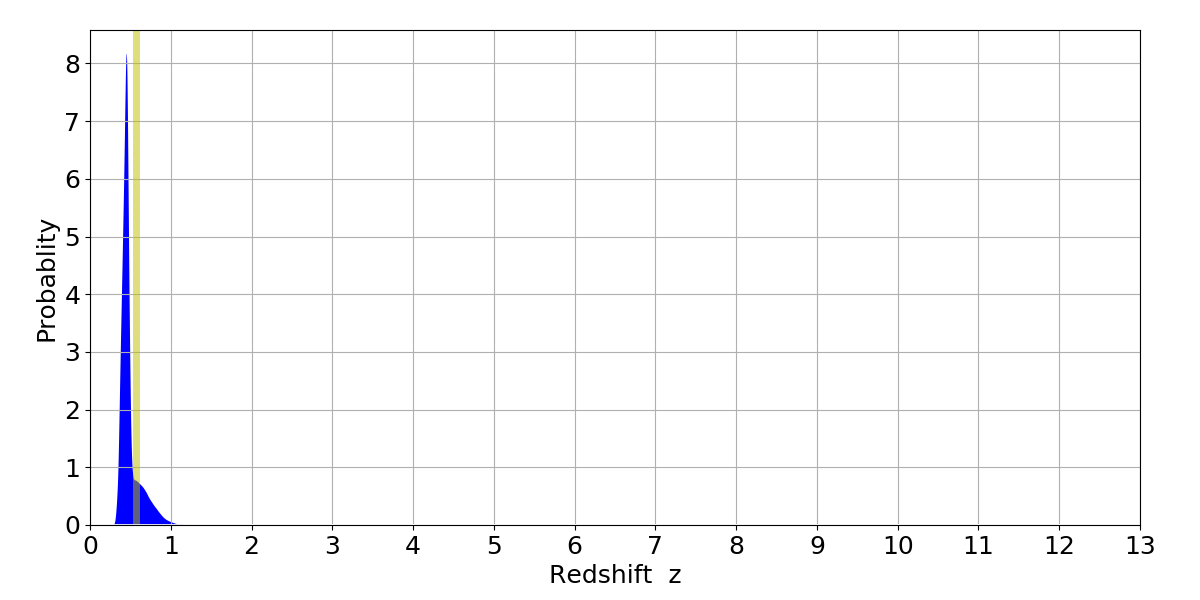 In P(z) plots: Yellow lines mark the cluster redshift z = 0.570,