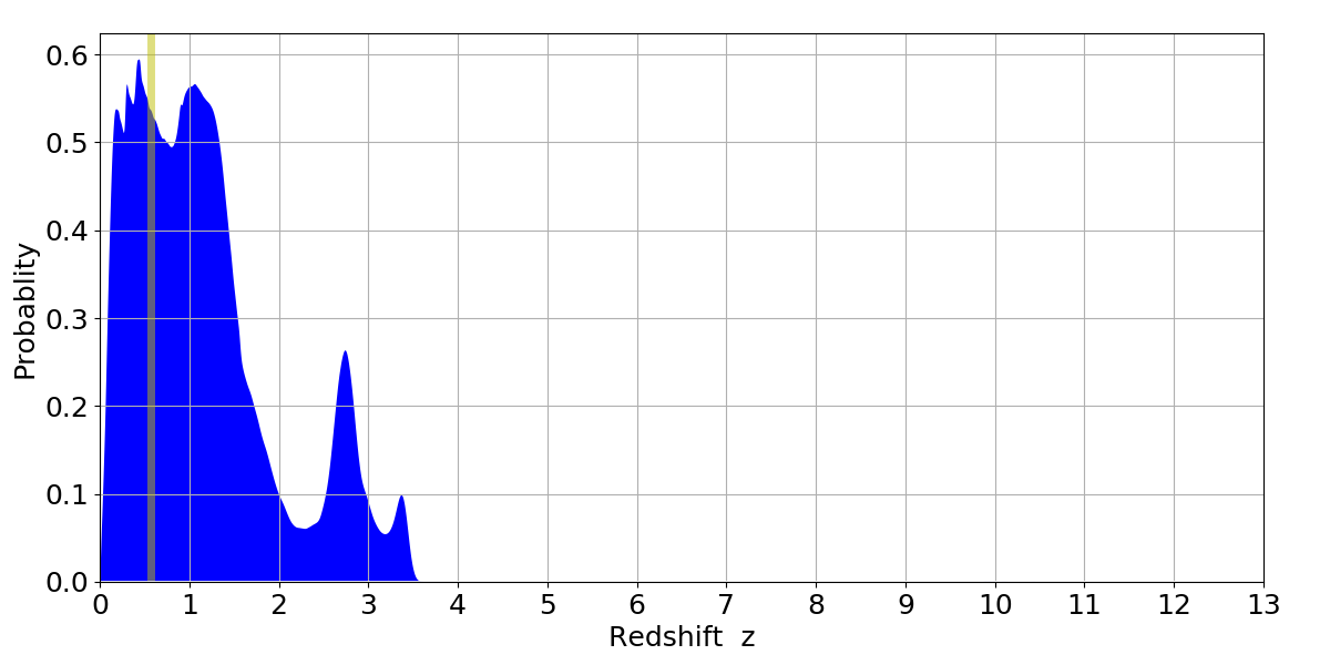 In P(z) plots: Yellow lines mark the cluster redshift z = 0.570,
