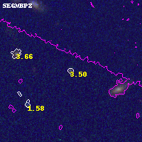 Object #12180 x,y = (4992, 3943) RA, Dec = (11:57:58.272, -10:46:58.80) = (179.49280, -10.78300) BPZ = 3.495 [0.200--3.673] type = 9.90 (SB3_B10 - SB2_B10) chisq2 = 0.45 ODDS = 0.41 z_cluster = 0.570