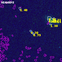 Object #12203 x,y = (5889, 3946) RA, Dec = (11:57:54.624, -10:46:58.44) = (179.47760, -10.78290) BPZ = 0.301 [0.124--3.096] type = 10.40 (SB3_B10 - SB11_A_0_l) chisq2 = 0.00 ODDS = 0.05 z_cluster = 0.570