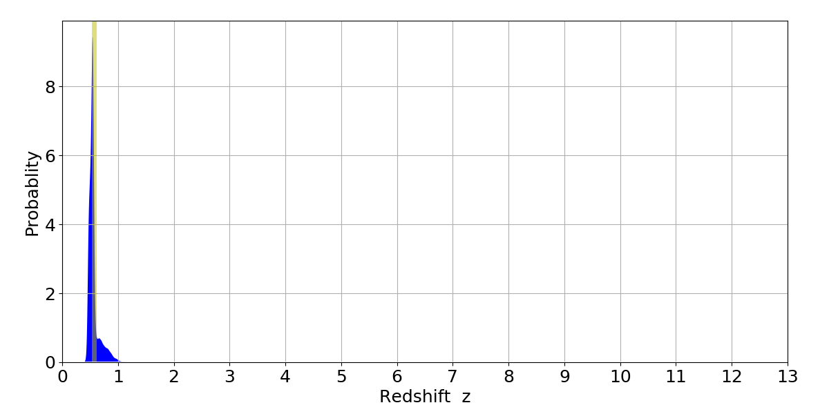 In P(z) plots: Yellow lines mark the cluster redshift z = 0.570,