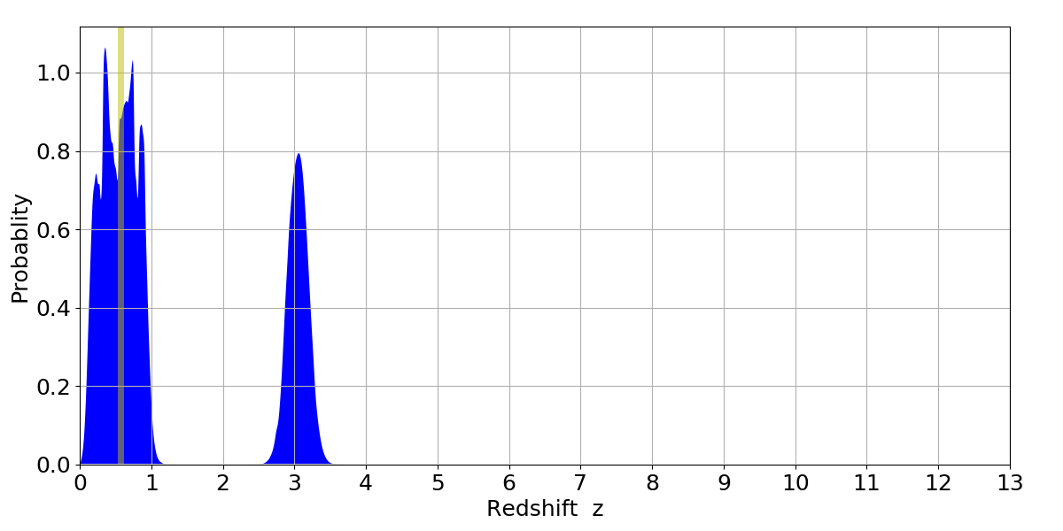 In P(z) plots: Yellow lines mark the cluster redshift z = 0.570,