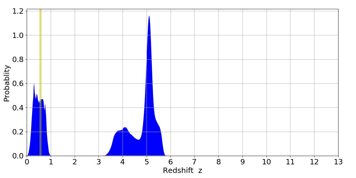 In P(z) plots: Yellow lines mark the cluster redshift z = 0.570,