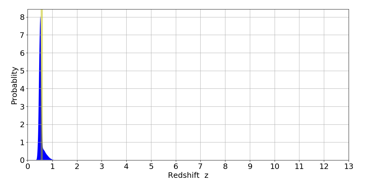 In P(z) plots: Yellow lines mark the cluster redshift z = 0.570,