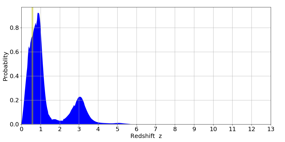 In P(z) plots: Yellow lines mark the cluster redshift z = 0.570,
