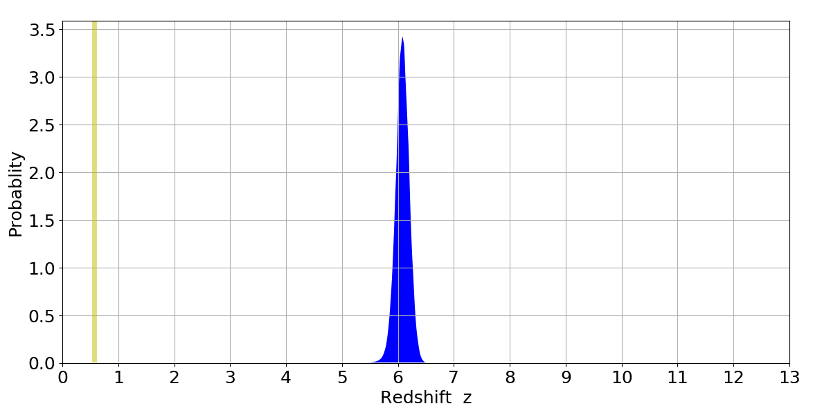 In P(z) plots: Yellow lines mark the cluster redshift z = 0.570,