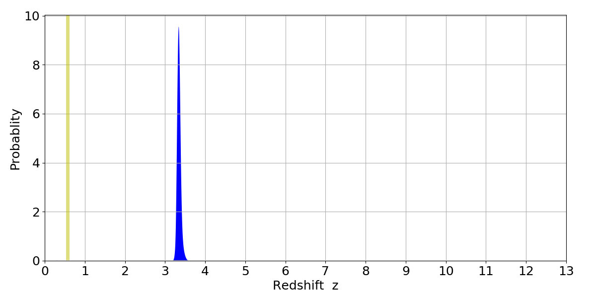 In P(z) plots: Yellow lines mark the cluster redshift z = 0.570,
