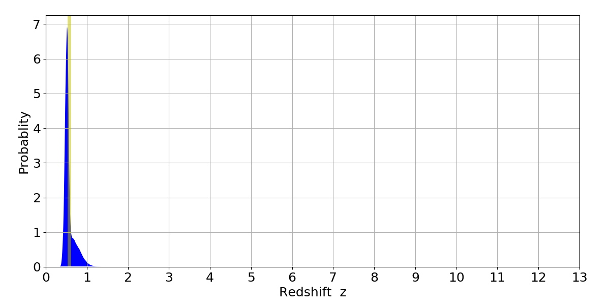 In P(z) plots: Yellow lines mark the cluster redshift z = 0.570,