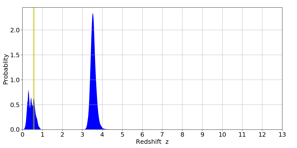 In P(z) plots: Yellow lines mark the cluster redshift z = 0.570,