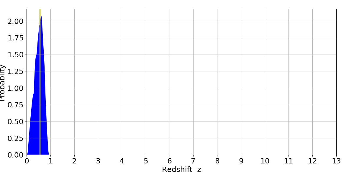 In P(z) plots: Yellow lines mark the cluster redshift z = 0.570,
