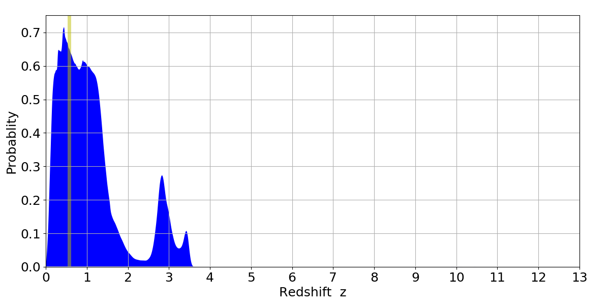 In P(z) plots: Yellow lines mark the cluster redshift z = 0.570,