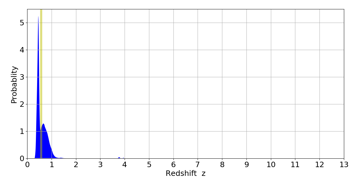 In P(z) plots: Yellow lines mark the cluster redshift z = 0.570,