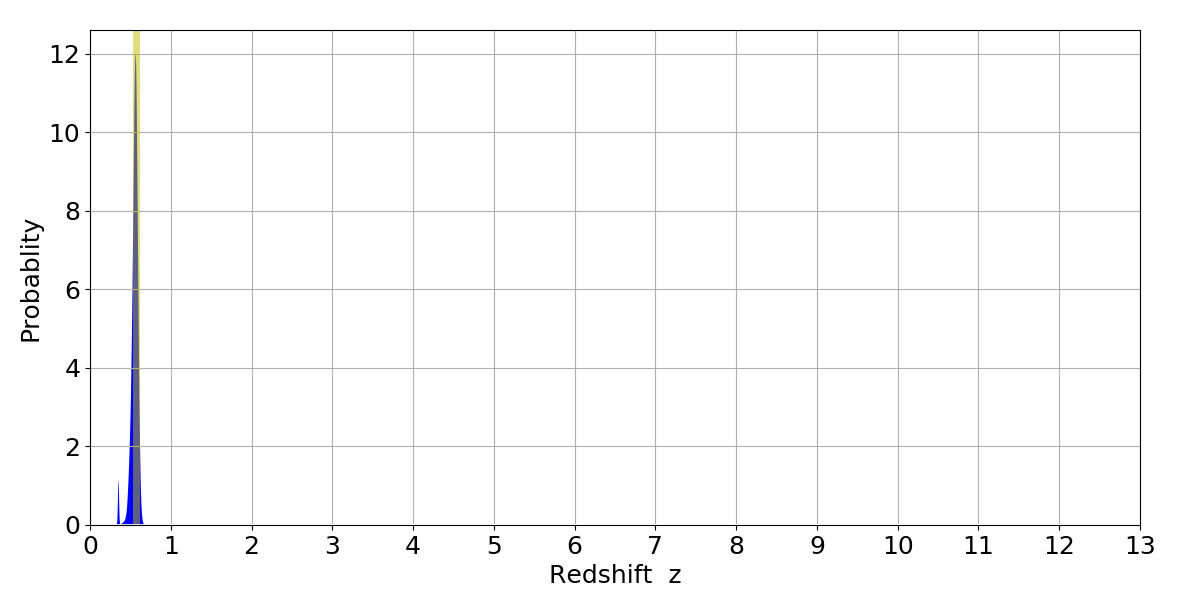 In P(z) plots: Yellow lines mark the cluster redshift z = 0.570,