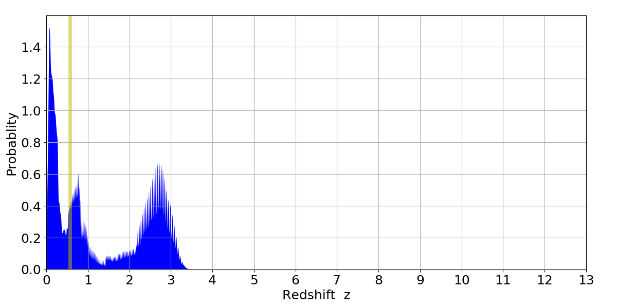 In P(z) plots: Yellow lines mark the cluster redshift z = 0.570,