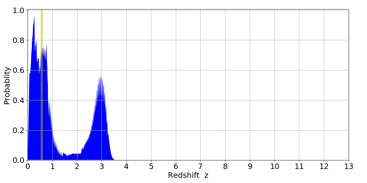 In P(z) plots: Yellow lines mark the cluster redshift z = 0.570,