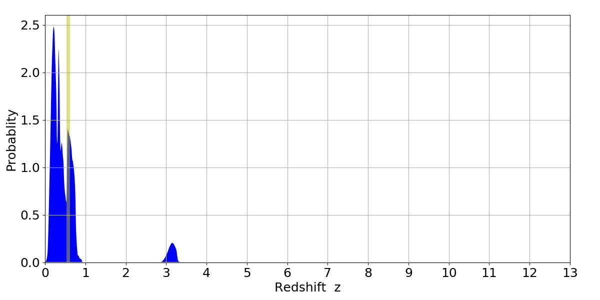 In P(z) plots: Yellow lines mark the cluster redshift z = 0.570,