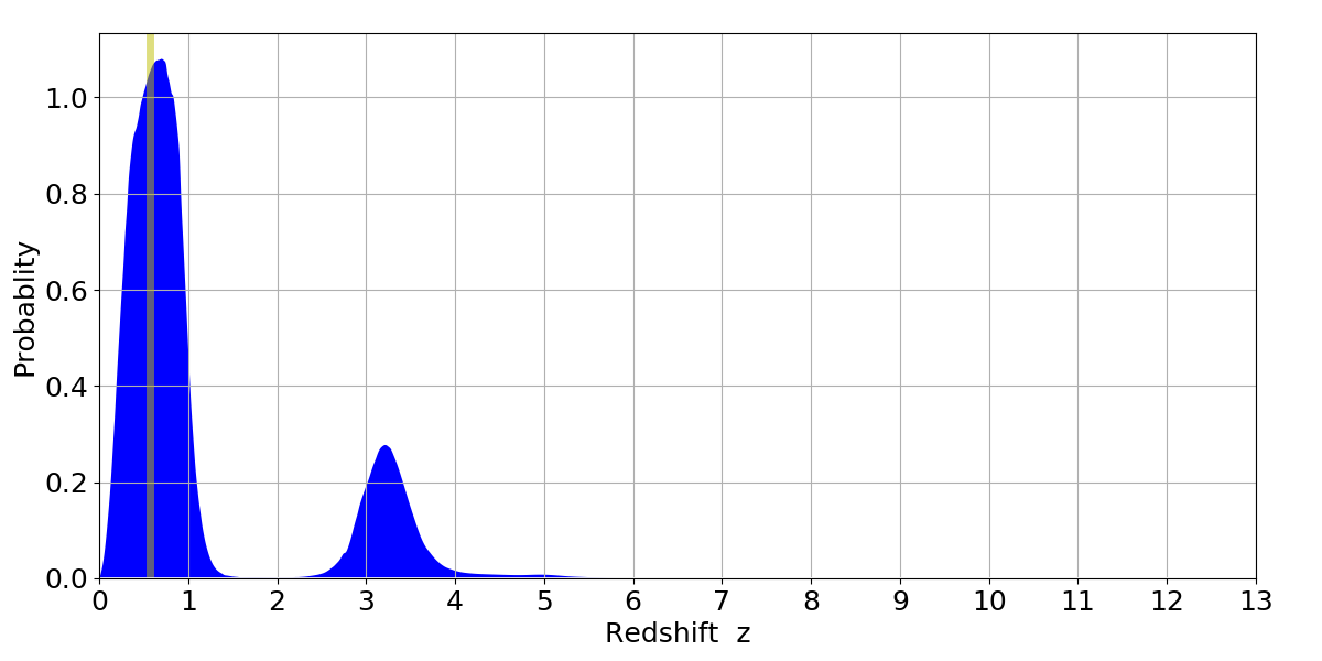 In P(z) plots: Yellow lines mark the cluster redshift z = 0.570,