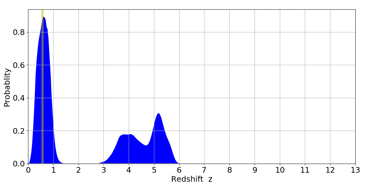In P(z) plots: Yellow lines mark the cluster redshift z = 0.570,