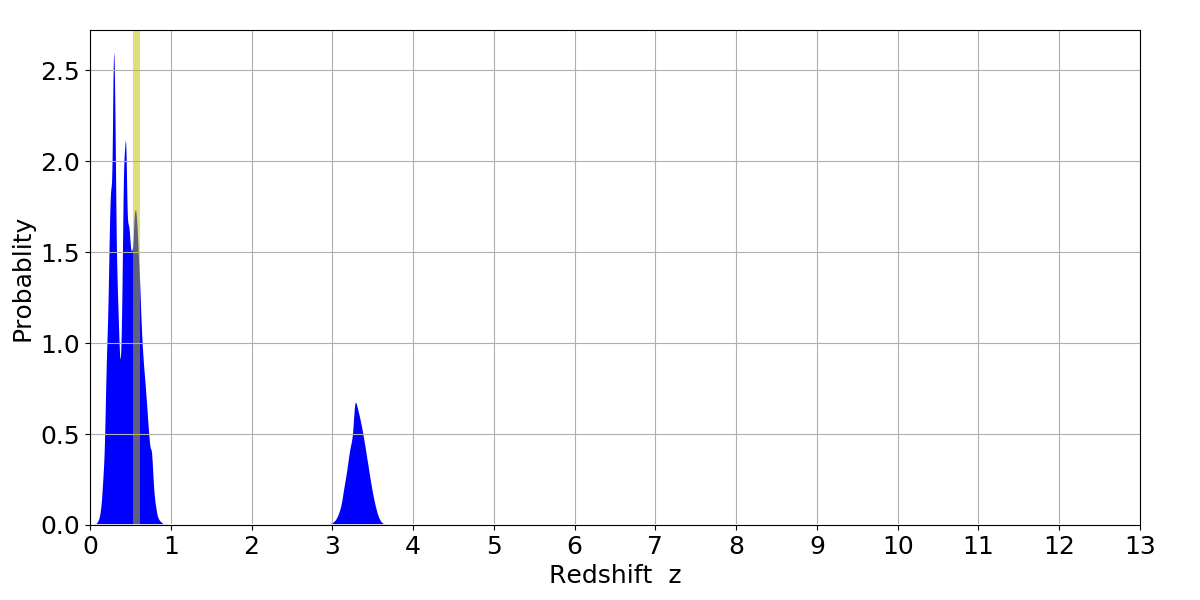 In P(z) plots: Yellow lines mark the cluster redshift z = 0.570,
