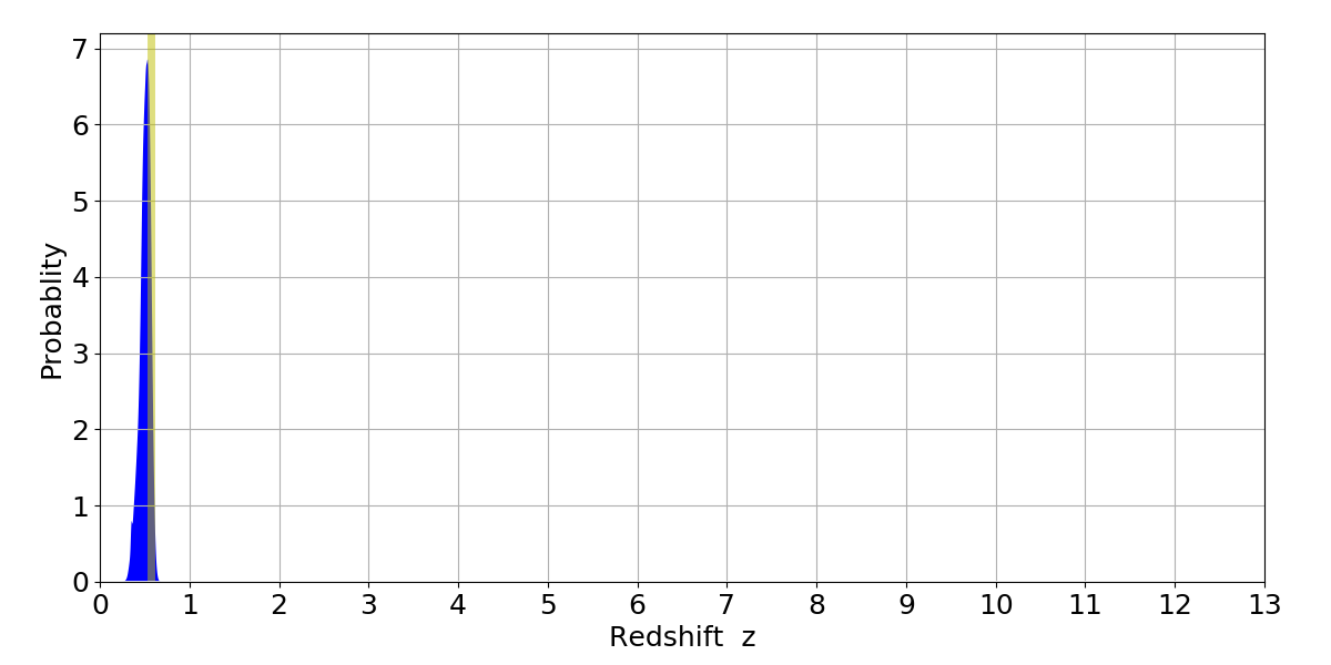 In P(z) plots: Yellow lines mark the cluster redshift z = 0.570,