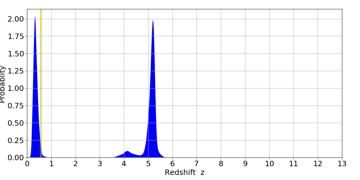 In P(z) plots: Yellow lines mark the cluster redshift z = 0.570,