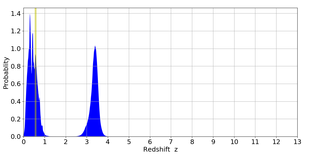 In P(z) plots: Yellow lines mark the cluster redshift z = 0.570,