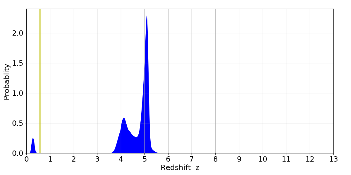 In P(z) plots: Yellow lines mark the cluster redshift z = 0.570,