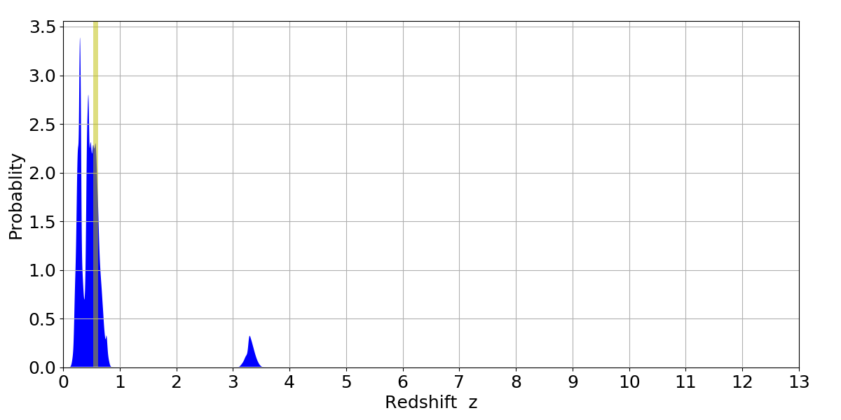 In P(z) plots: Yellow lines mark the cluster redshift z = 0.570,