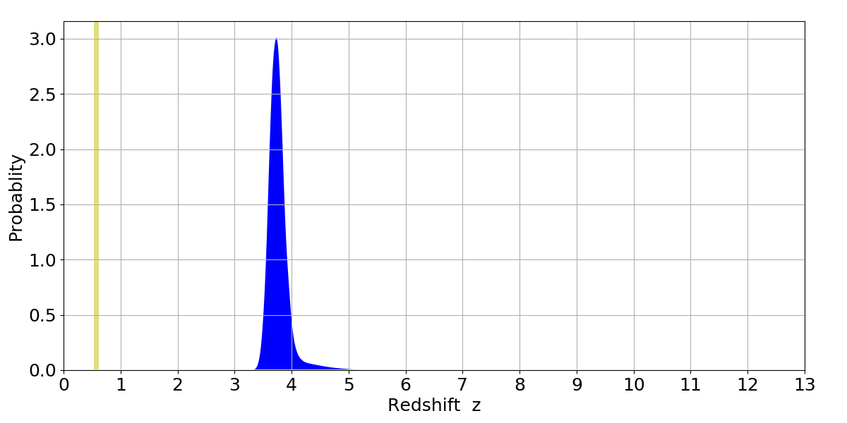 In P(z) plots: Yellow lines mark the cluster redshift z = 0.570,