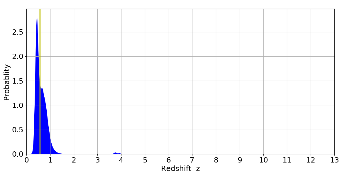 In P(z) plots: Yellow lines mark the cluster redshift z = 0.570,