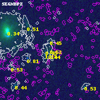 Object #19791 x,y = (3695, 5960) RA, Dec = (11:58:03.576, -10:44:57.84) = (179.51490, -10.74940) BPZ = 0.515 [0.191--1.788] type = 7.40 (Scd_B10 - SB1_B10) chisq2 = 0.00 ODDS = 0.15 z_cluster = 0.570