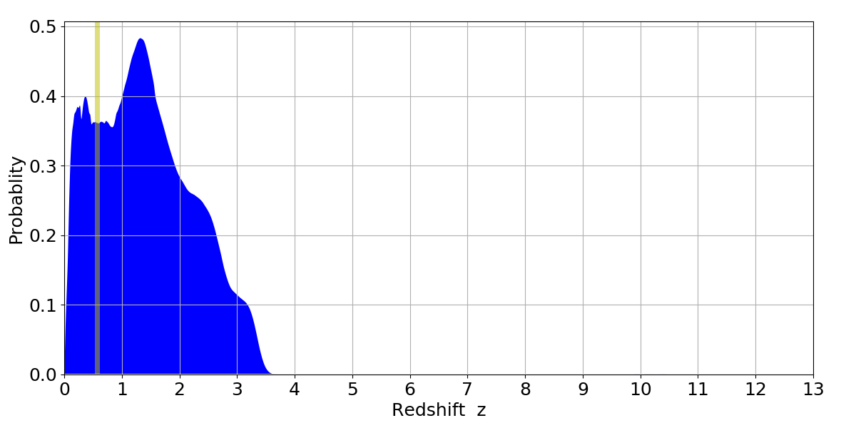 In P(z) plots: Yellow lines mark the cluster redshift z = 0.570,