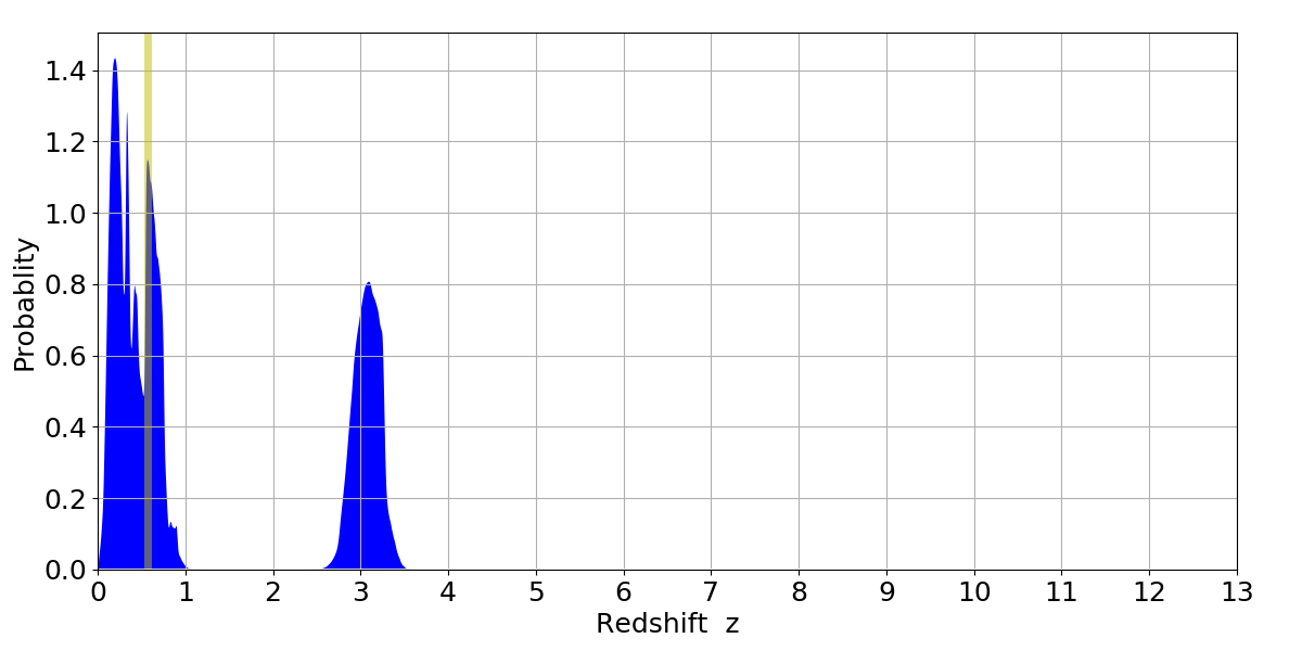 In P(z) plots: Yellow lines mark the cluster redshift z = 0.570,