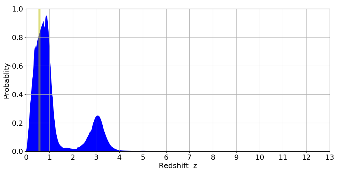 In P(z) plots: Yellow lines mark the cluster redshift z = 0.570,