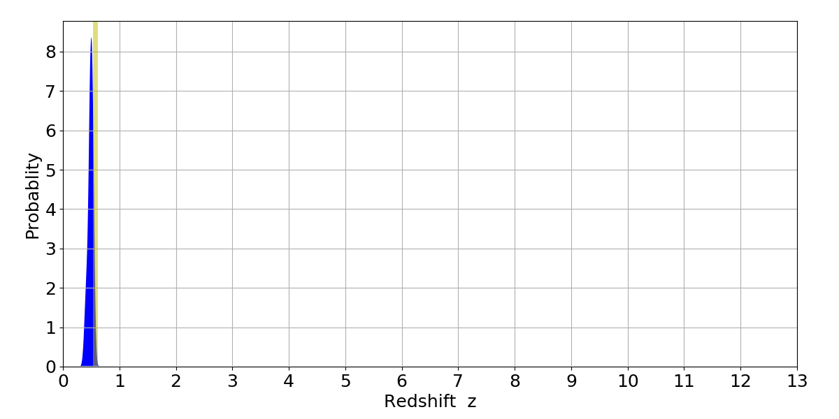 In P(z) plots: Yellow lines mark the cluster redshift z = 0.570,