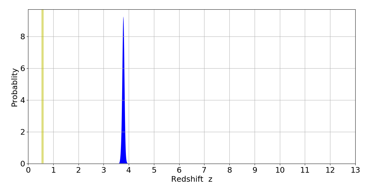 In P(z) plots: Yellow lines mark the cluster redshift z = 0.570,