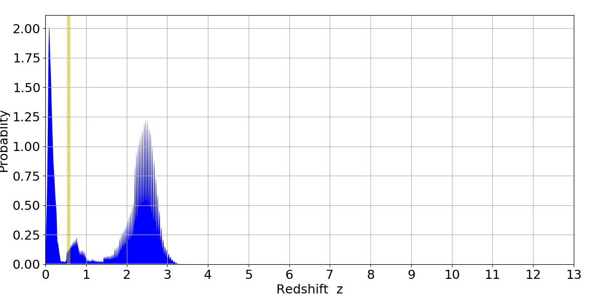 In P(z) plots: Yellow lines mark the cluster redshift z = 0.570,