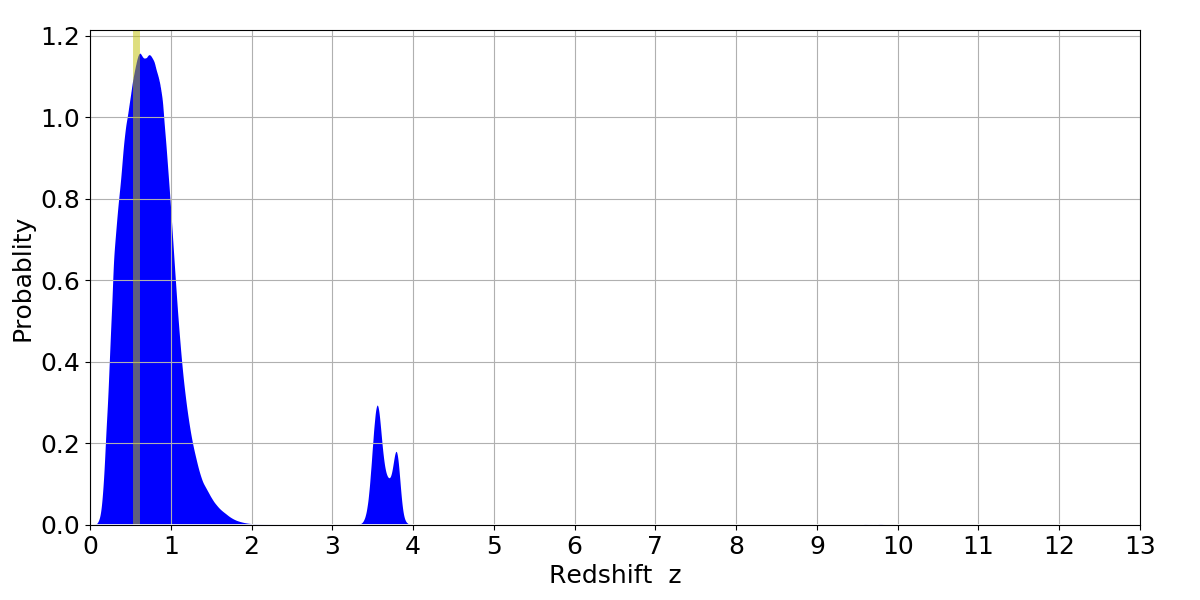In P(z) plots: Yellow lines mark the cluster redshift z = 0.570,