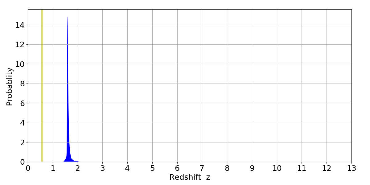 In P(z) plots: Yellow lines mark the cluster redshift z = 0.570,