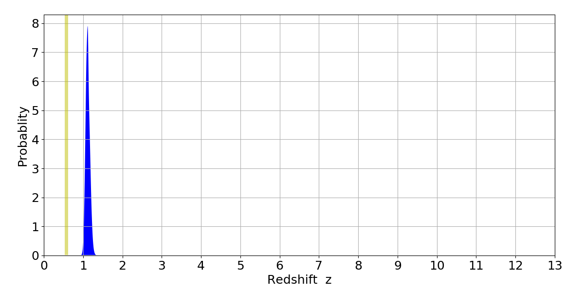 In P(z) plots: Yellow lines mark the cluster redshift z = 0.570,
