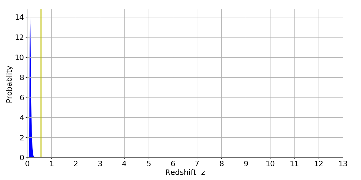 In P(z) plots: Yellow lines mark the cluster redshift z = 0.570,