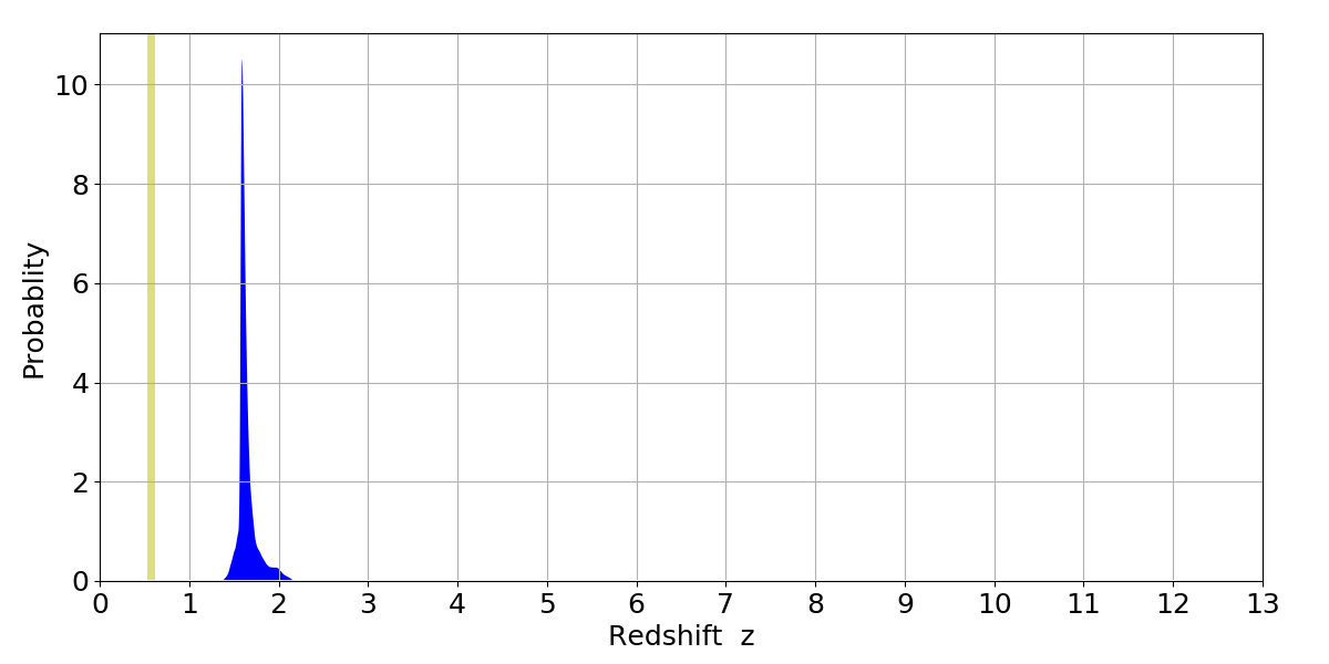 In P(z) plots: Yellow lines mark the cluster redshift z = 0.570,