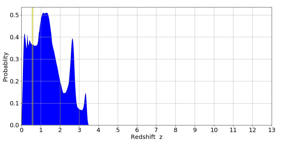 In P(z) plots: Yellow lines mark the cluster redshift z = 0.570,