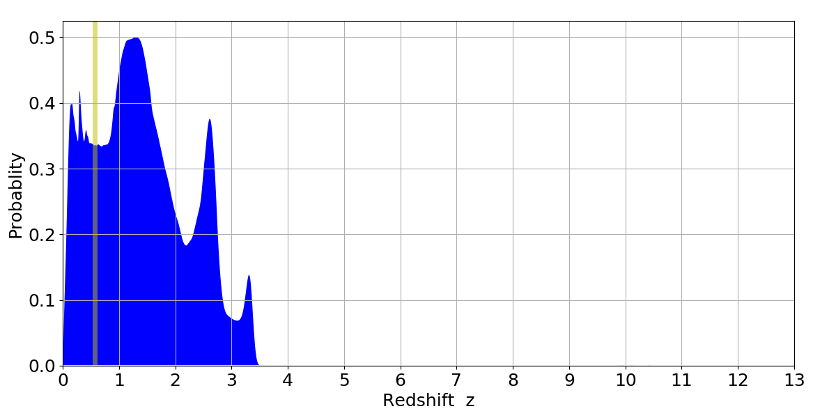 In P(z) plots: Yellow lines mark the cluster redshift z = 0.570,