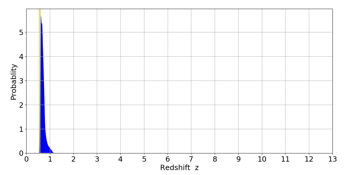 In P(z) plots: Yellow lines mark the cluster redshift z = 0.570,