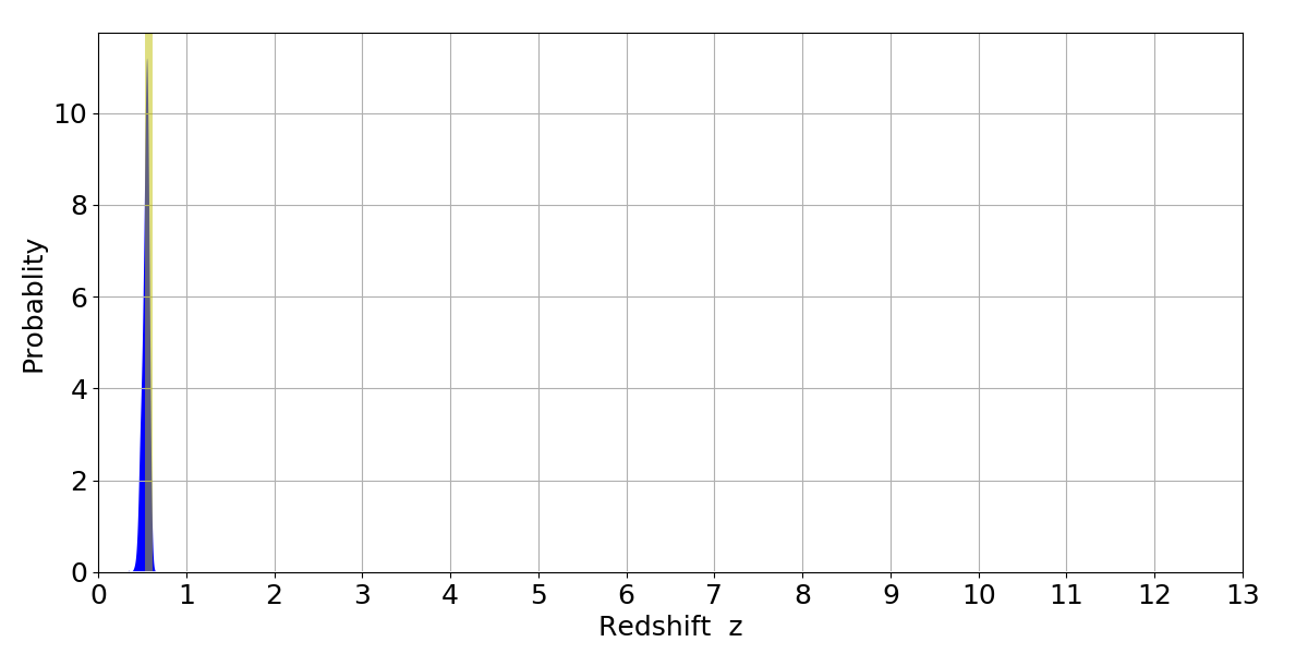 In P(z) plots: Yellow lines mark the cluster redshift z = 0.570,