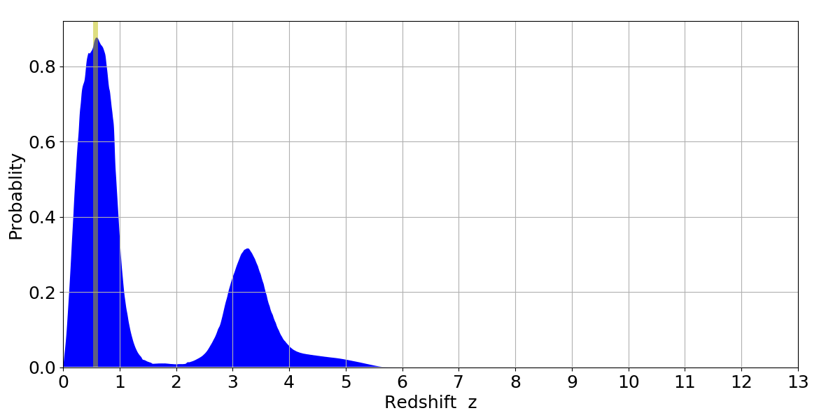 In P(z) plots: Yellow lines mark the cluster redshift z = 0.570,