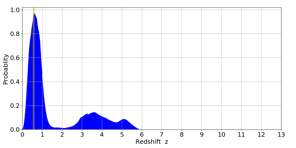 In P(z) plots: Yellow lines mark the cluster redshift z = 0.570,