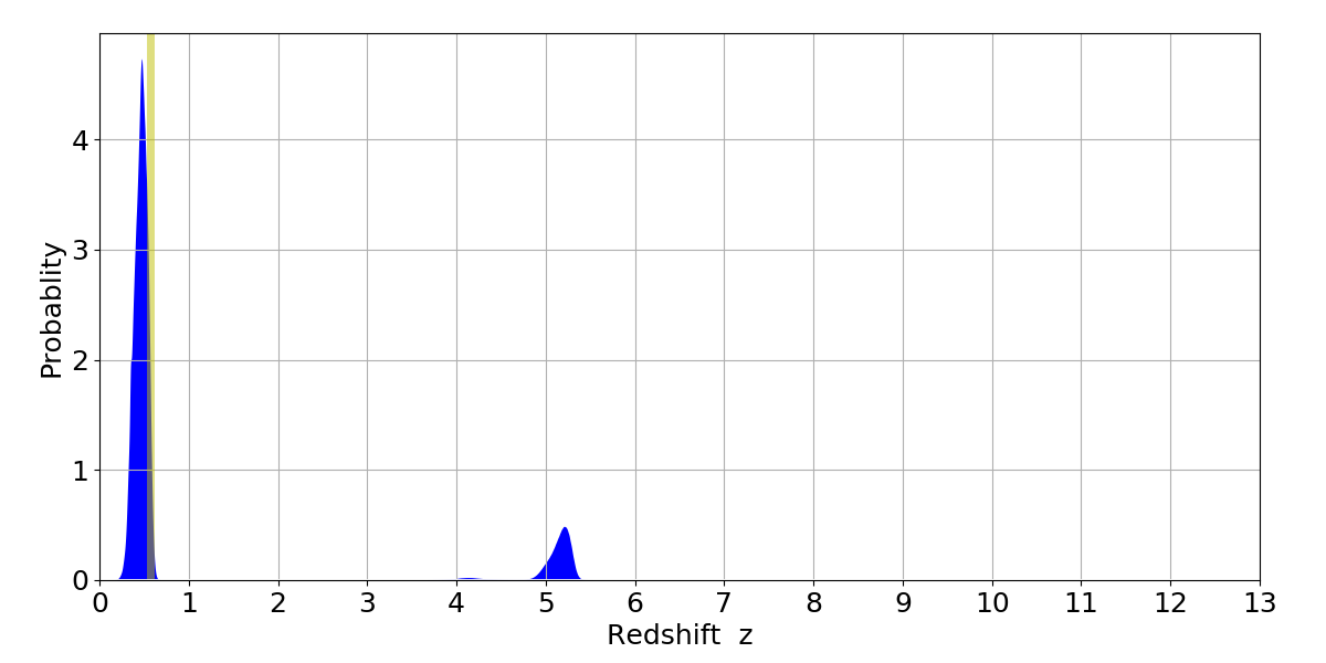 In P(z) plots: Yellow lines mark the cluster redshift z = 0.570,