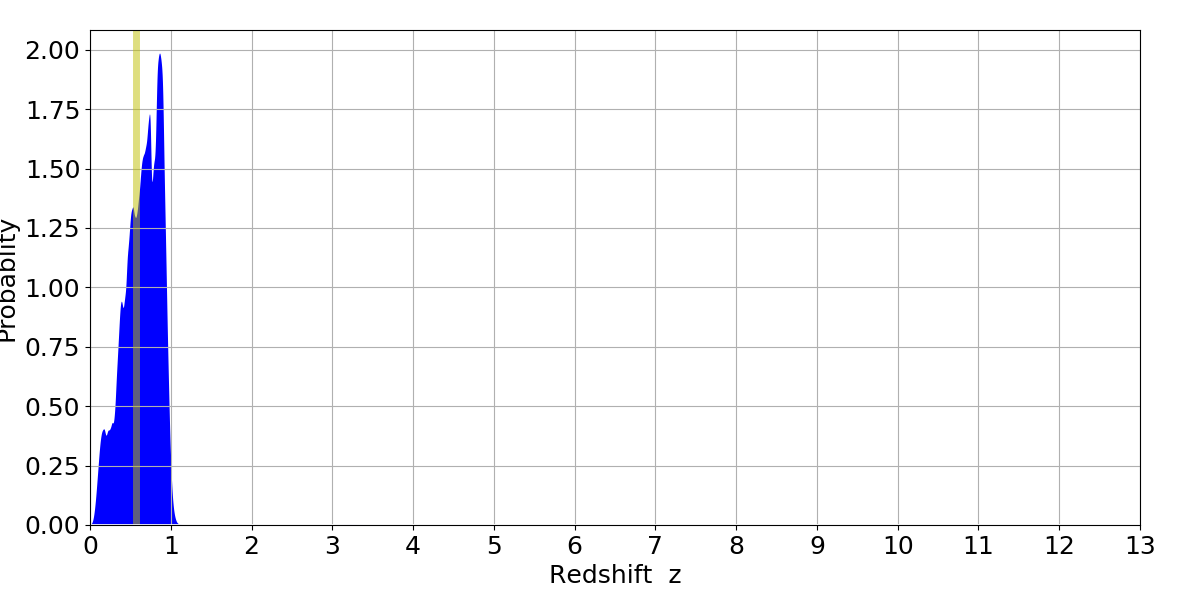 In P(z) plots: Yellow lines mark the cluster redshift z = 0.570,